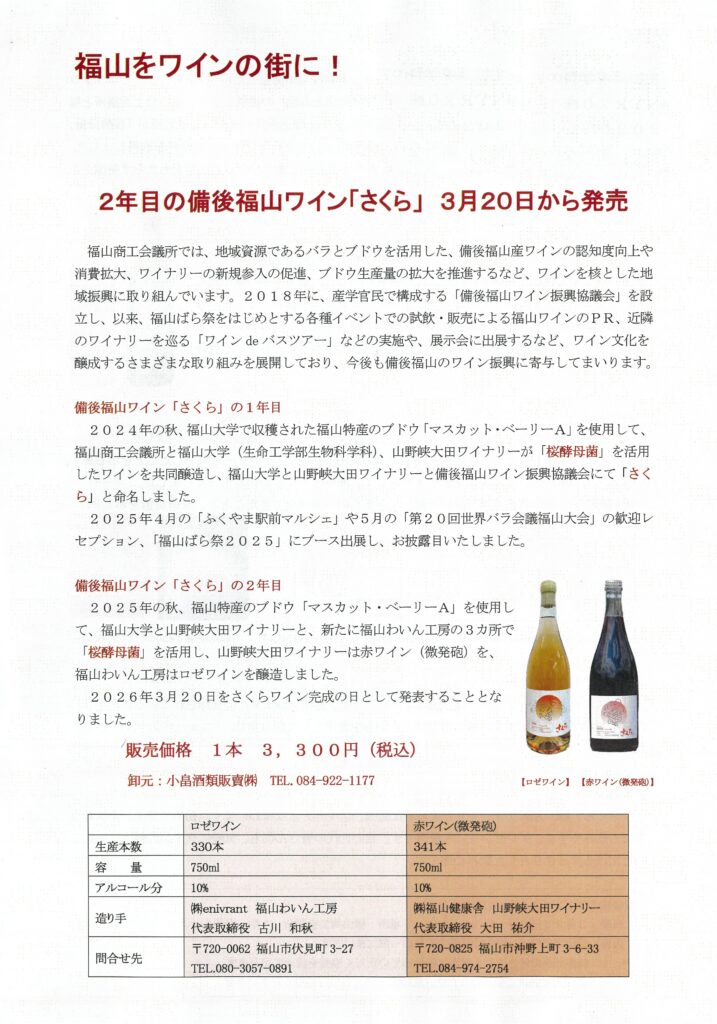 ※桜酵母菌とは、奈良女子大学の岩口准教授らが開発した、バラ科のナラノヤエザクラ由来の酵母の提供を受け、福山商工会議所と福山大学が共同研究。「桜酵母菌」による新たなワイン製造法を確立したものです。独特の深みのある旨味と柔らかな口当たりをもたらす特徴があります。